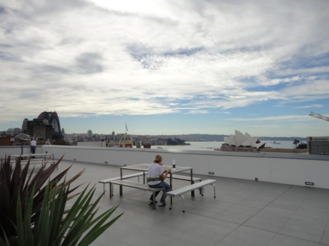 Ficamos só em albergues da Juventude (YHA). Em todas as cidades que íamos sempre tinha um. Muito seguro e com armários, tomadas e iluminarias individuais. Sentia-me bem à vontade. Principalmente com o custo baixo. O valor mais caro de diária que paguei em albergue foi 40,00 dólares, isso por que ficava na cara do gol, olha a vista da porta do meu quarto em Sydney.