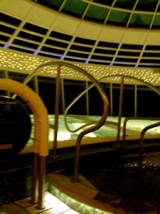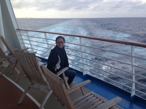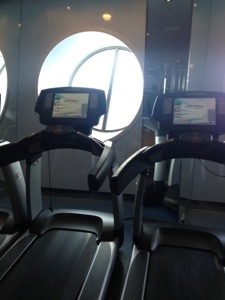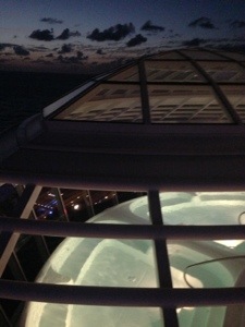 Nossa cabine tinha um quarto grande, com uma janela que ia do teto ao chão, mas ficava na frente no navio, bem na proa. Uma vista razoável, o problema é que periodicamente aparecia pessoas lá na frente, então não dava pra ficar com a janela aberta todo o tempo …