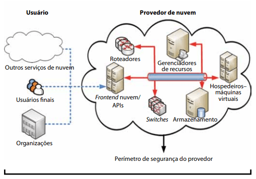 A Figura 15 permite fazer a identificação que, o acesso do lado do usuário aos serviços do provedor de nuvem precisa ultrapassar o perímetro de segurança do provedor, que é comum bem controlado e provido de recursos de segurança. Também pode-se perceber que, dentro do provedor de nuvem, existem diversas interações que possuem ocorrência no intuito de gerir a própria nuvem e fornecer os serviços com solicitação pelos usuários. Neste contexto, os mecanismos e controles de segurança geralmente não possuem acessibilidade por parte do usuário. Esse fato acaba levando o usuário do serviço de nuvem a ter confiança que, a segurança tem tratamento de forma satisfatória dentro dela.